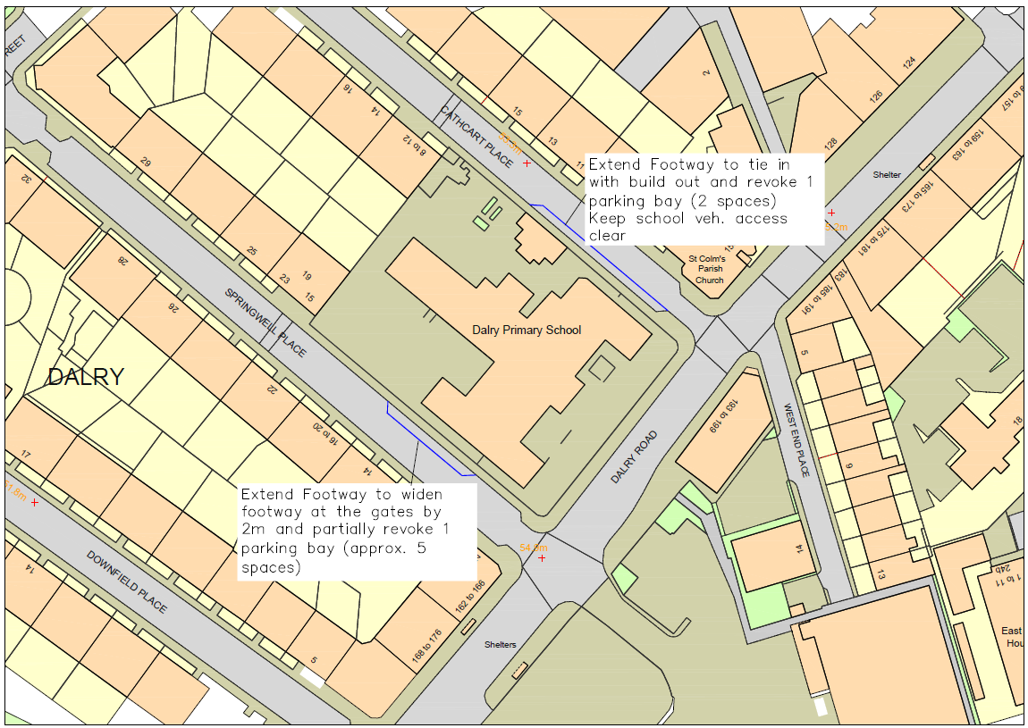 – Cathcart Place – extend footway to tie in with existing build-out and revoke 1 parking bay (approx. 2 spaces) to keep vehicle access clear