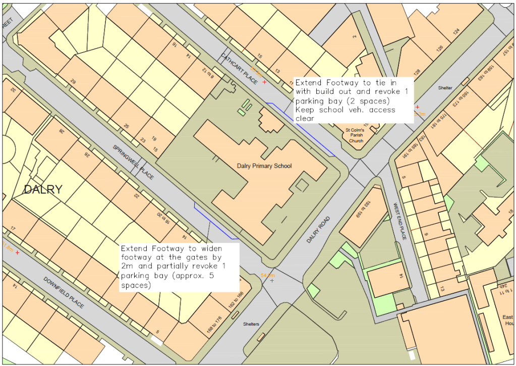 – Springwell Place – Extend footway at gate by 2m and partially revoke 1 parking bay (approx. 5 spaces)