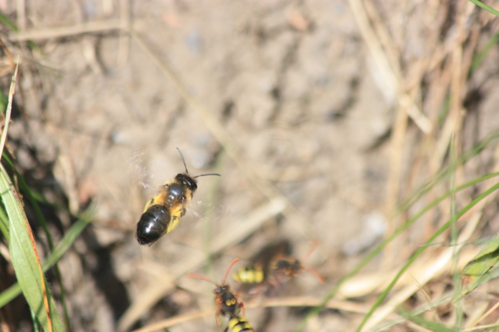After a few days, some smaller solitary bees started hanging around near the mining bees. We did some research and found out that these are nomad cuckoo bees, which parasitise the mining bees by laying their eggs in the same tunnels. As time went on, more and more nomad bees were hovering around the entrance to the mining bee colony. The mining bees had to brave their parasites to get into their own homes. One day, we saw a dark edged bee fly, which also parasitises solitary bees by laying eggs in the same tunnels. The first eggs laid deep down in the tunnels by the mining bees will eventually develop into mining bees but the later eggs will be eaten by the larvae of the cuckoo bees and it will be cuckoo bees that eventually emerge, unless of course those eggs in turn have been eaten by the larvae of the bee flies! It’s amazing to witness this drama happening!