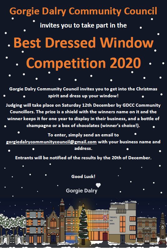 If you are business in Gorgie or Dalry, we invite you to festively dress your window. Judging will take place on Saturday 12th December by GDCC Community Councillors. The prize is a shield with the winners name on it that the winner gets to keep for one year to display in their business, and a bottle of champagne or a box of chocolates (winner’s choice!).