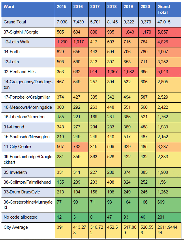 - Despite only comprising 6.5% of the population of the City of Edinburgh, 12.5% of fly tipping reports in 2020 were in Sighthill/Gorgie. This is 39.5% more reports than any other ward in the city, and 133 more reports per year on average.