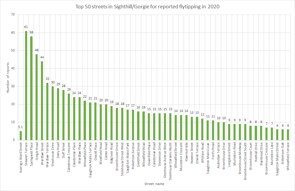 - Data requested by Gorgie Dalry Community Council from the City of Edinburgh Council shows that Sighthill/Gorgie was the worst ward in 2020 for reports of fly tipping, and that it is experiencing the largest sustained increase in reported fly tipping across the city.