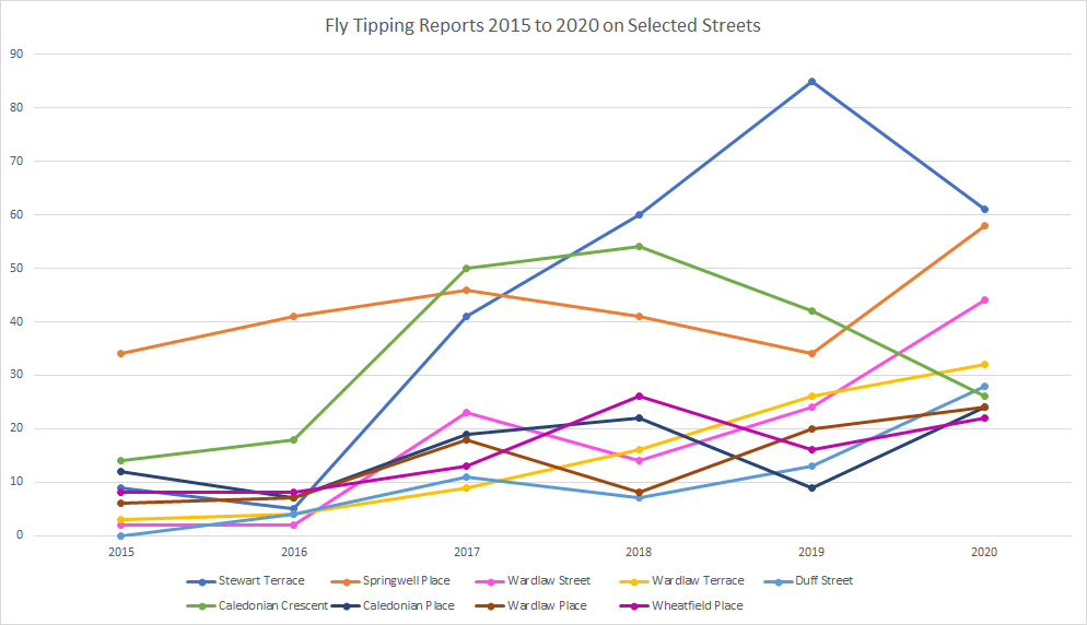These data confirm what residents have been reporting to us throughout 2020: that fly tipping in Gorgie/Dalry is a constant problem, is significantly worse than in other parts of the city, and has become more frequent over time.